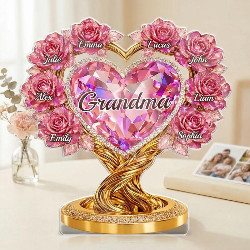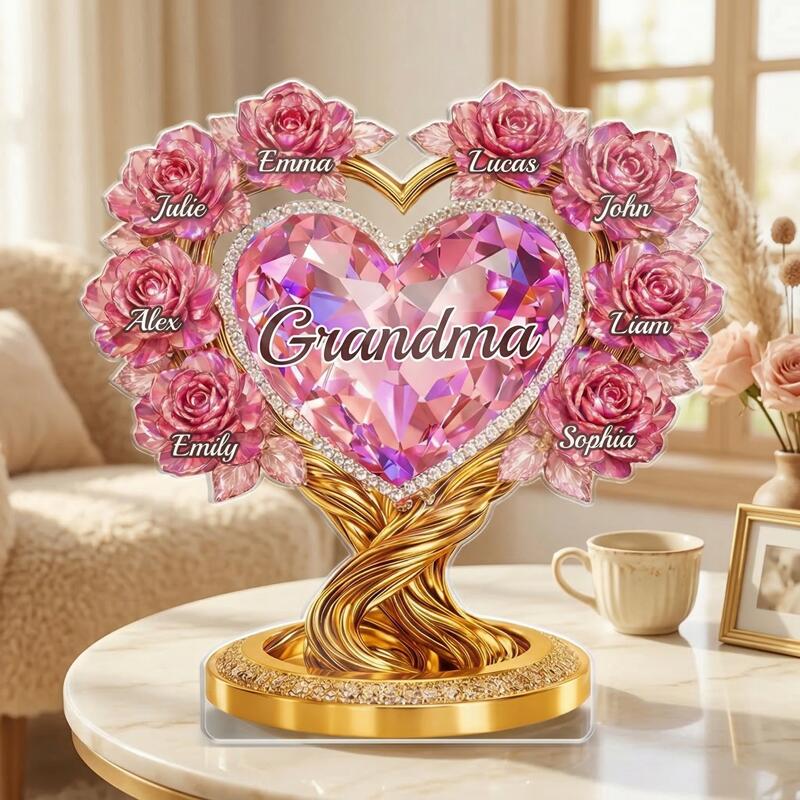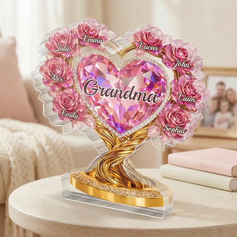 Placa de bloque acrílico personalizada corazón de diamante nombres de flores personalizados regalo exquisito para querida mamá
