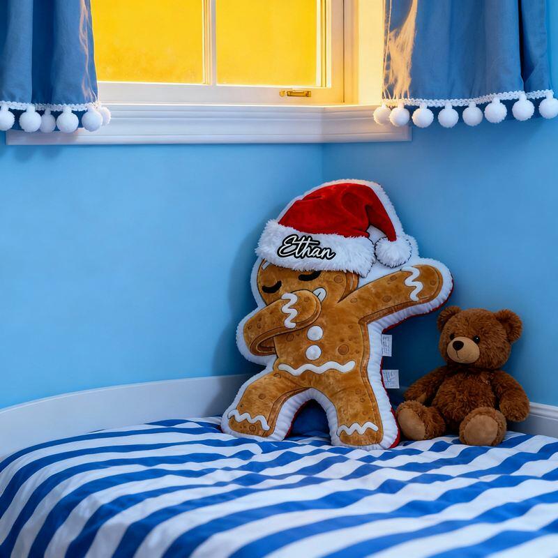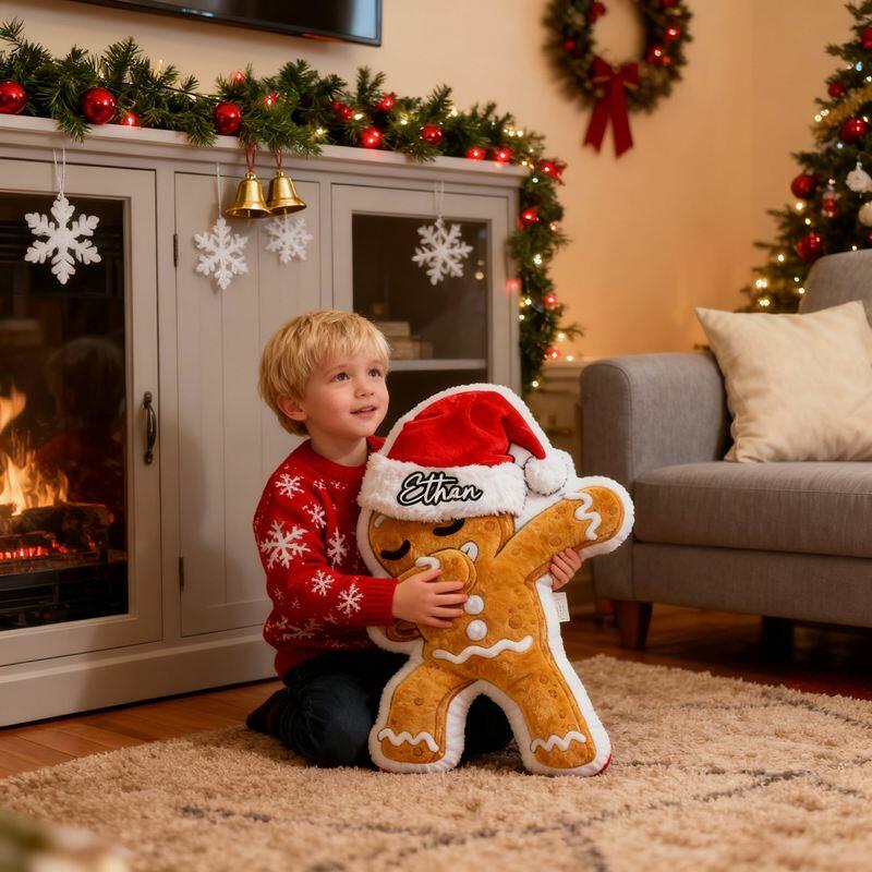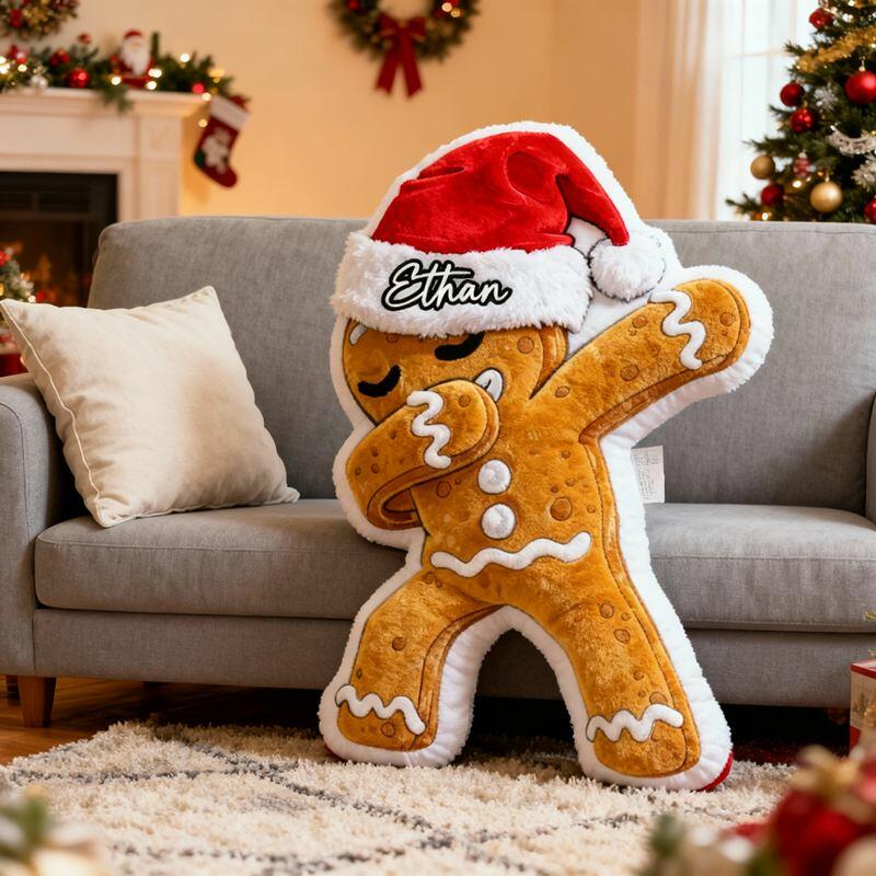 Almohada personalizada con forma de hombre de jengibre con gorro de Papá Noel, ideal como regalo de Navidad para niños.
