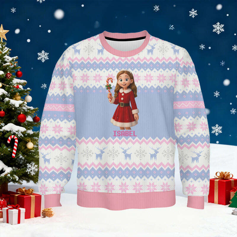 Suéter feo personalizado para niños, unisex, con foto personalizada, diseño morado elegante, regalo de Navidad para niñas