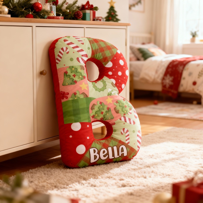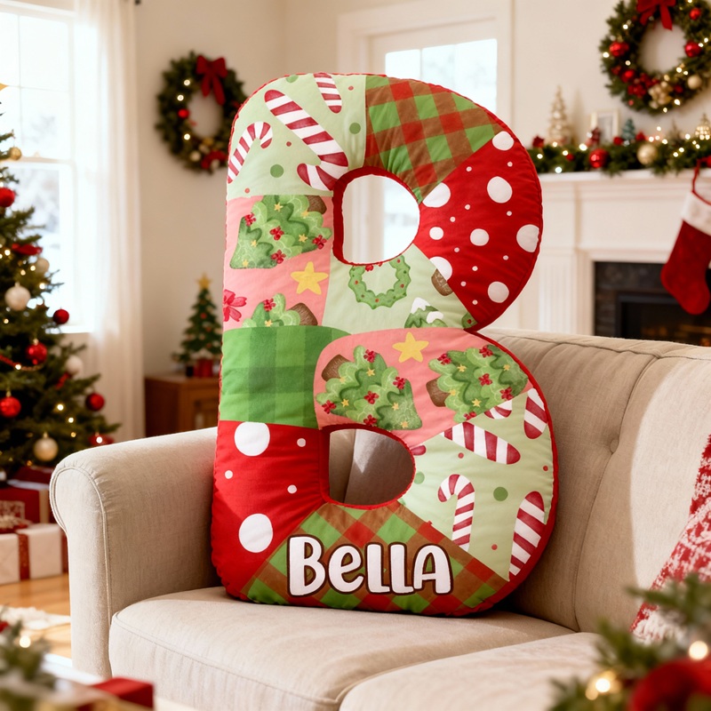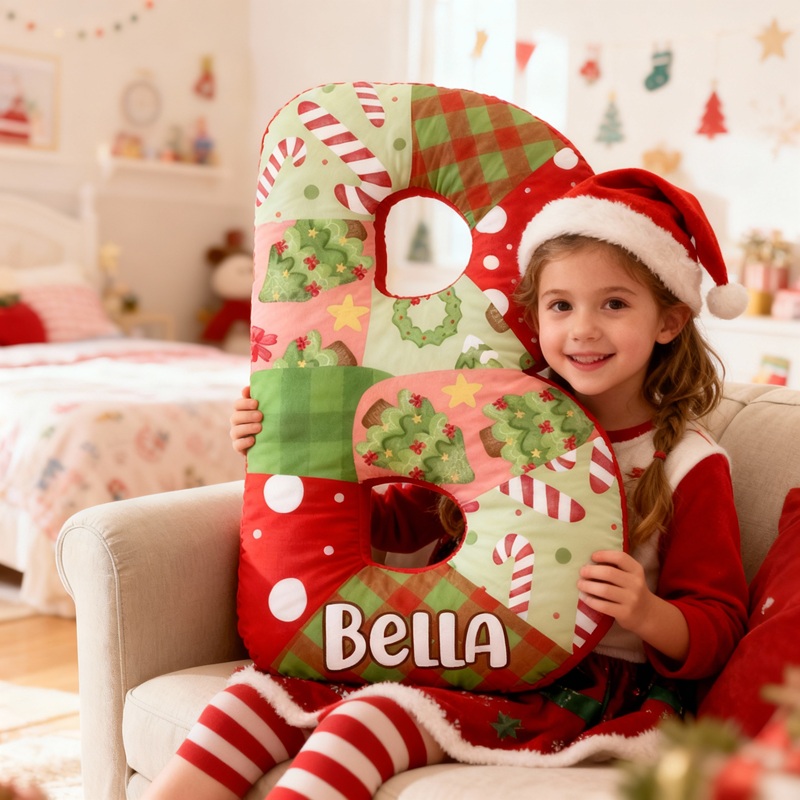 Almohada personalizada con forma de letra, decoración navideña, diseño estilo collage, regalo para niños