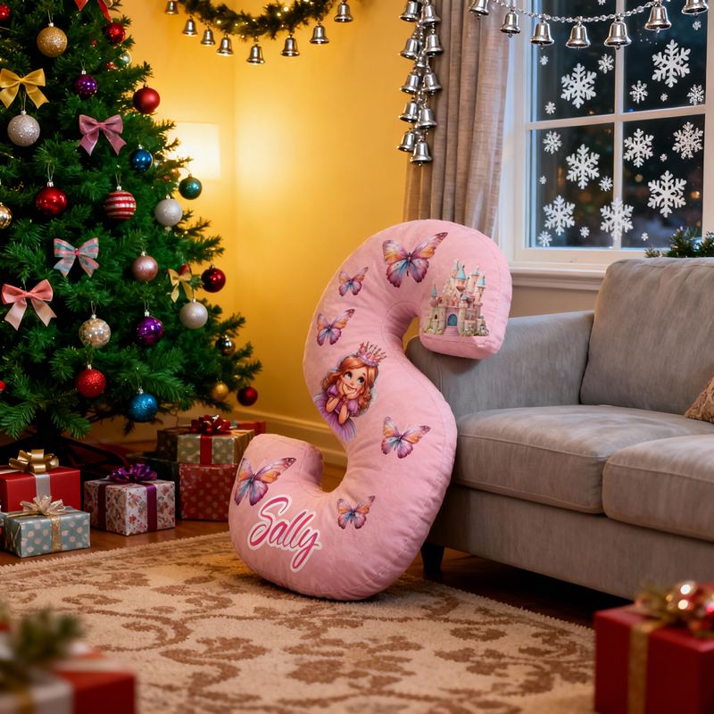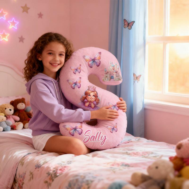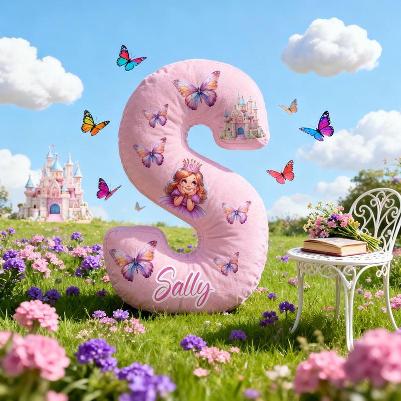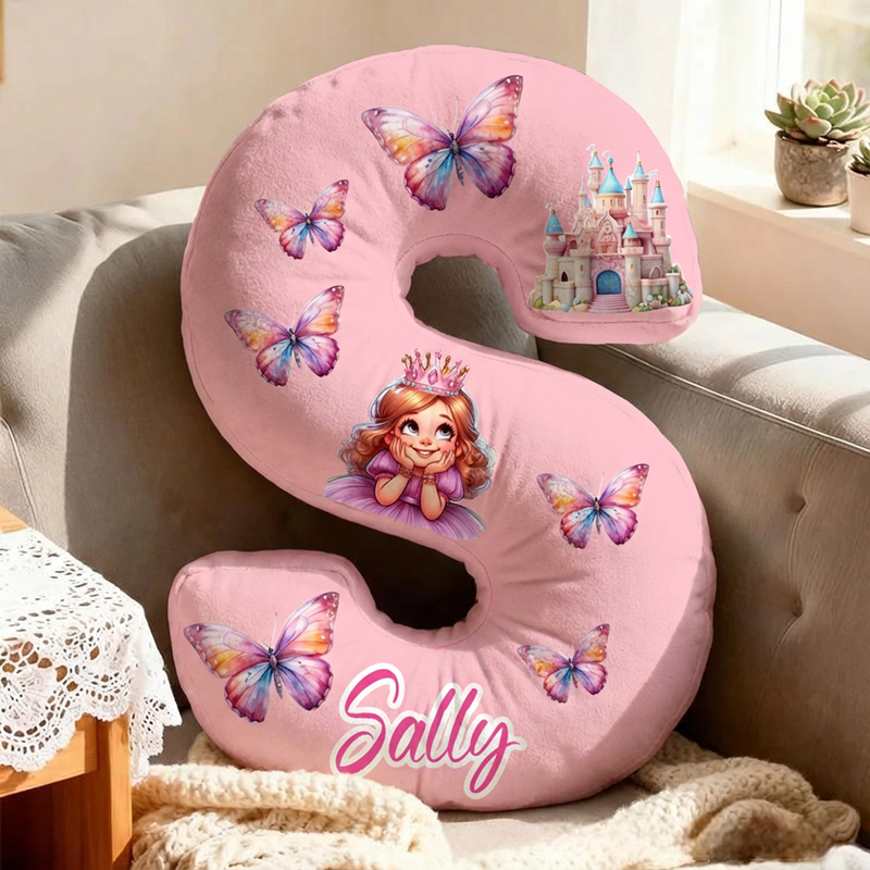 Almohada personalizada con forma de letra con diseño de niña de fantasía y mariposa de castillo, regalo para niños