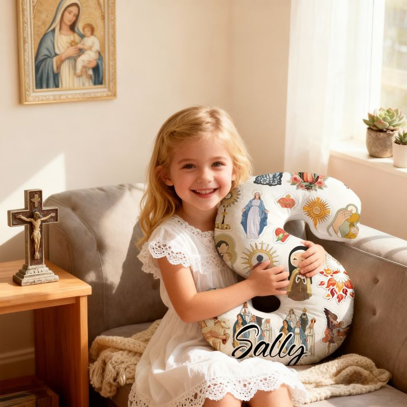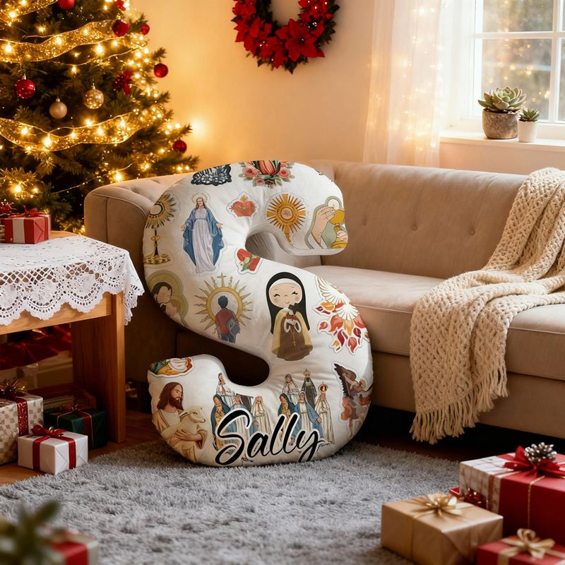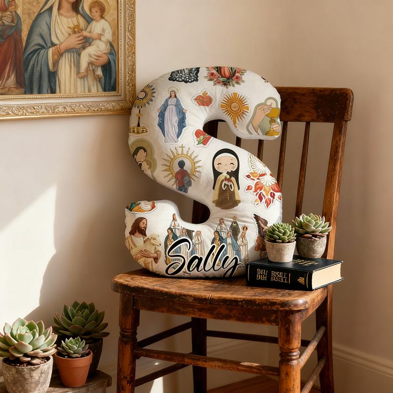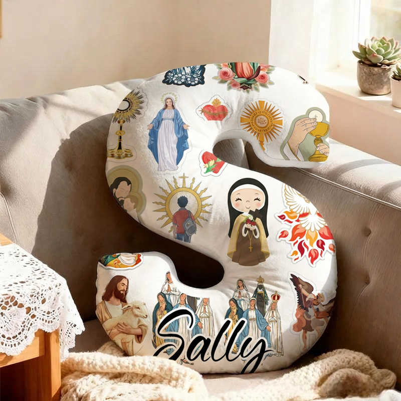Almohada personalizada con forma de letra, diseño de collage de Jesús y la Virgen María, regalo religioso