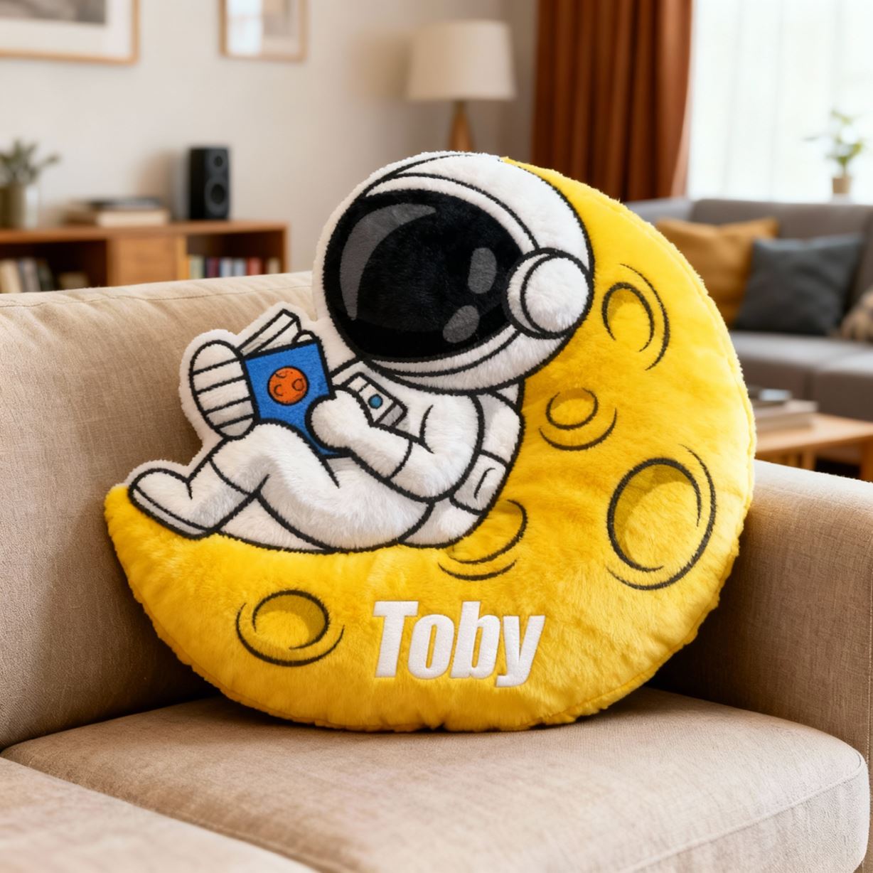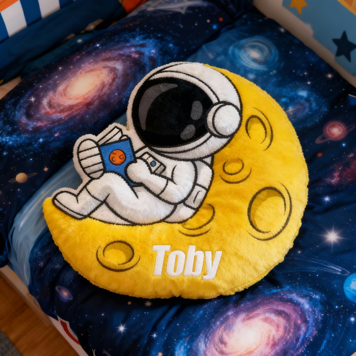 Cojín de peluche personalizado con diseño de astronauta de dibujos animados y luna para niños.