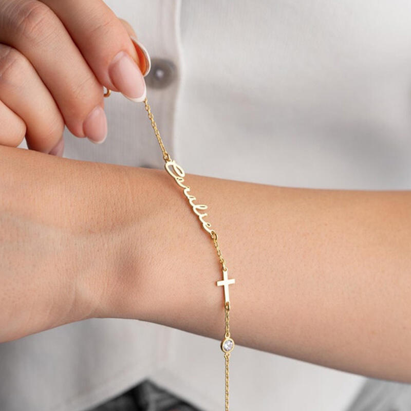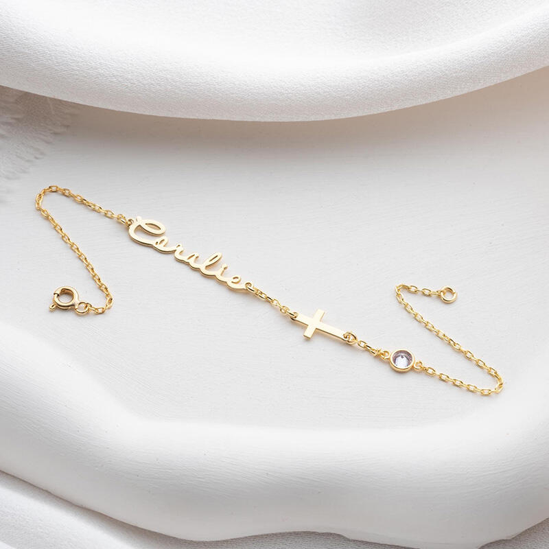 Pulsera personalizada con nombre, cruz y piedra de nacimiento, regalo para la familia.
