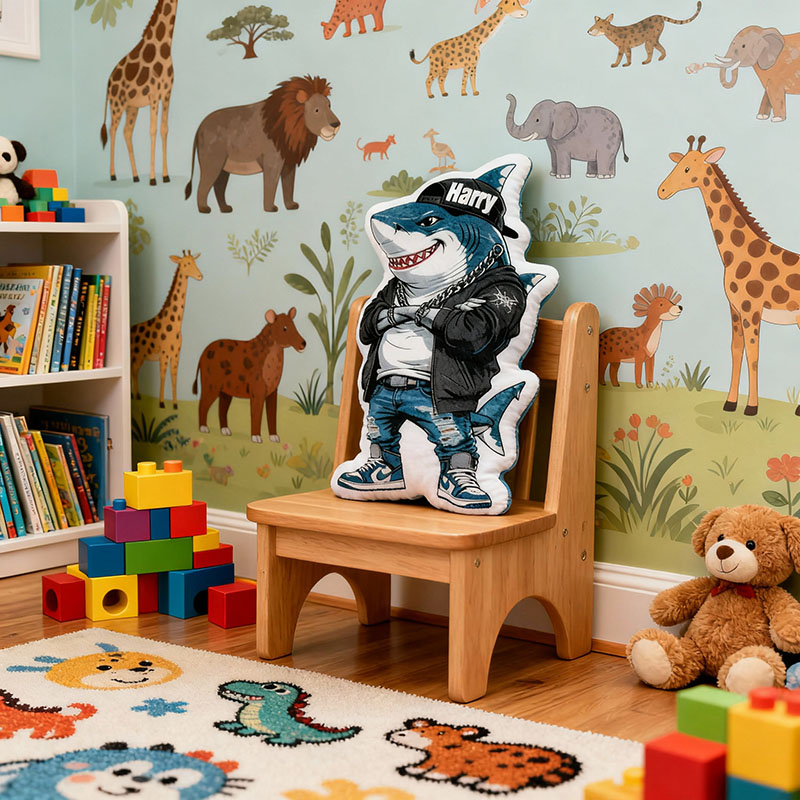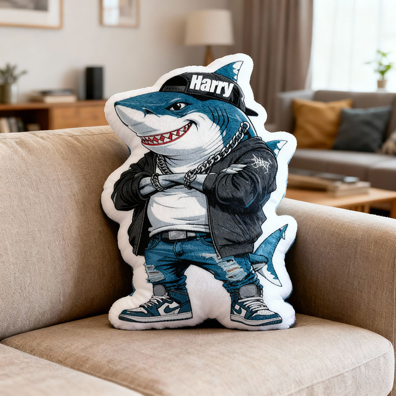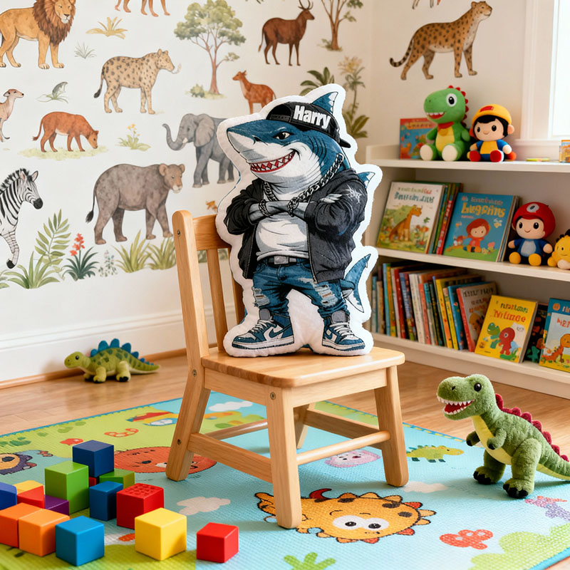 Cojín personalizado con nombre en forma de tiburón. Un regalo delicado para niños.