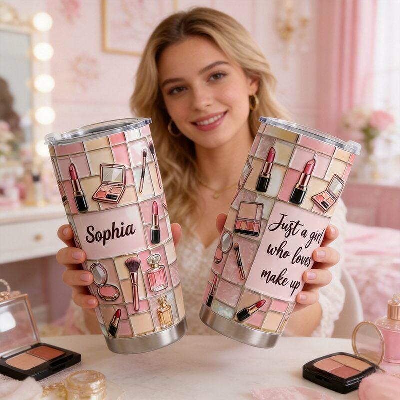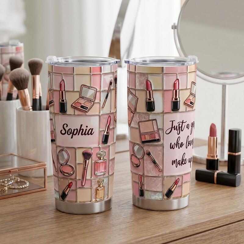 Vaso con nombre personalizado con diseños de herramientas de maquillaje hermoso regalo para niñas