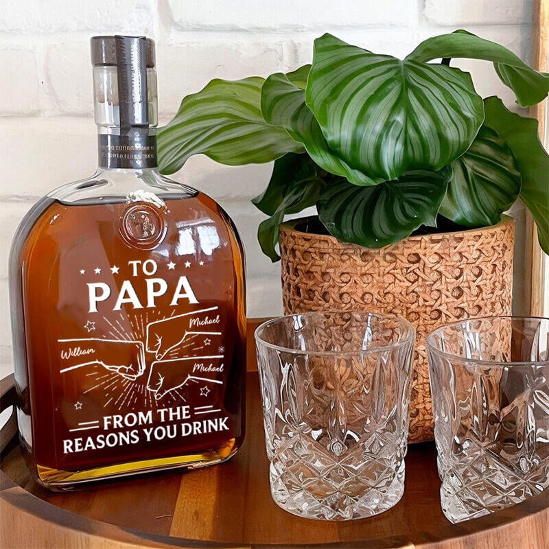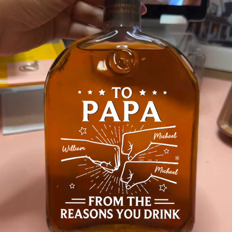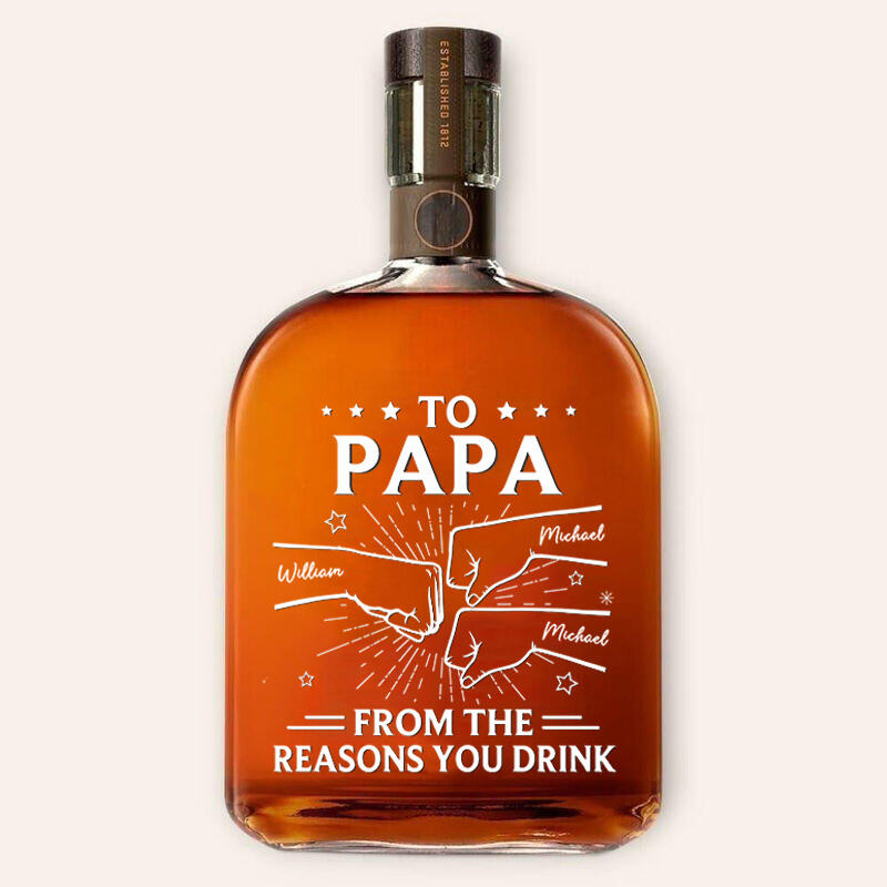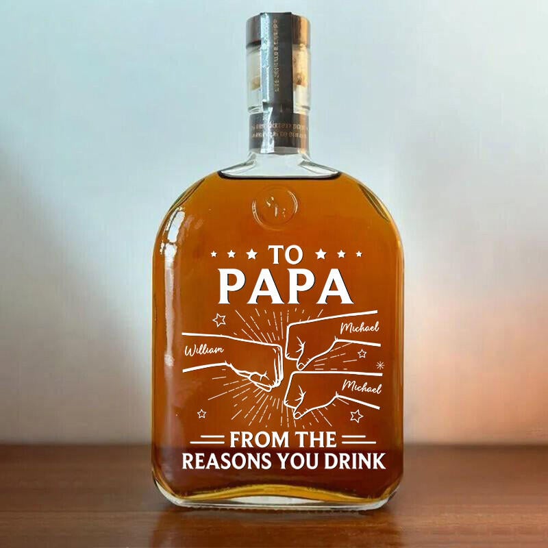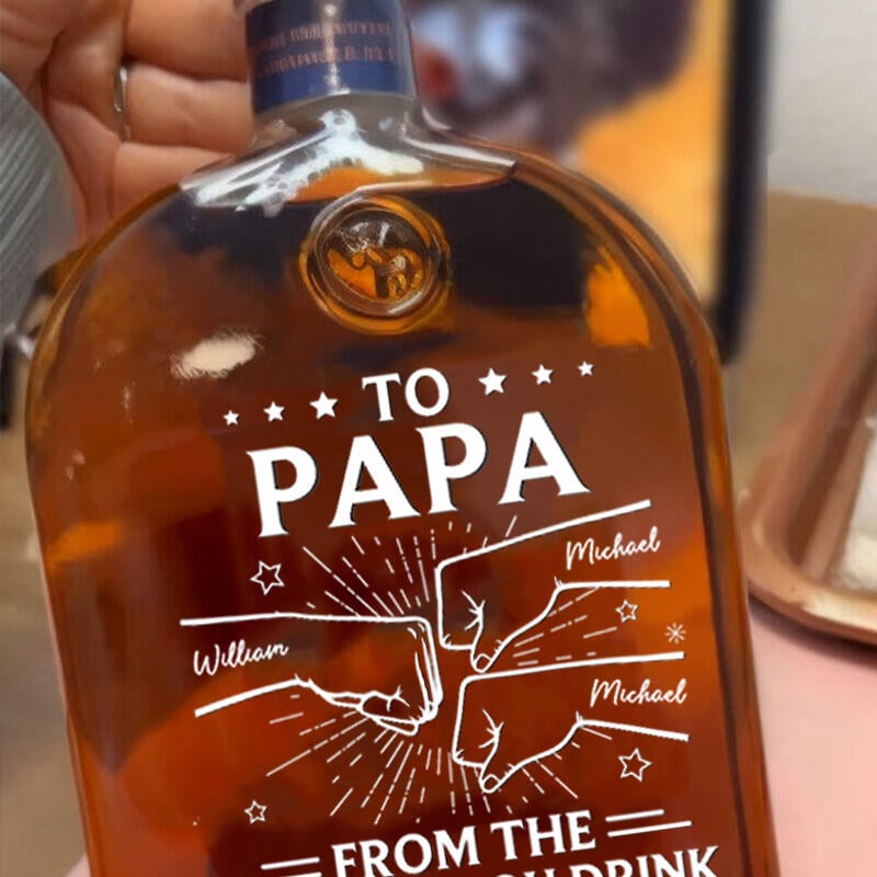 Botella de whisky con nombre personalizado y diseño de puño cerrado. Regalo especial para papá.