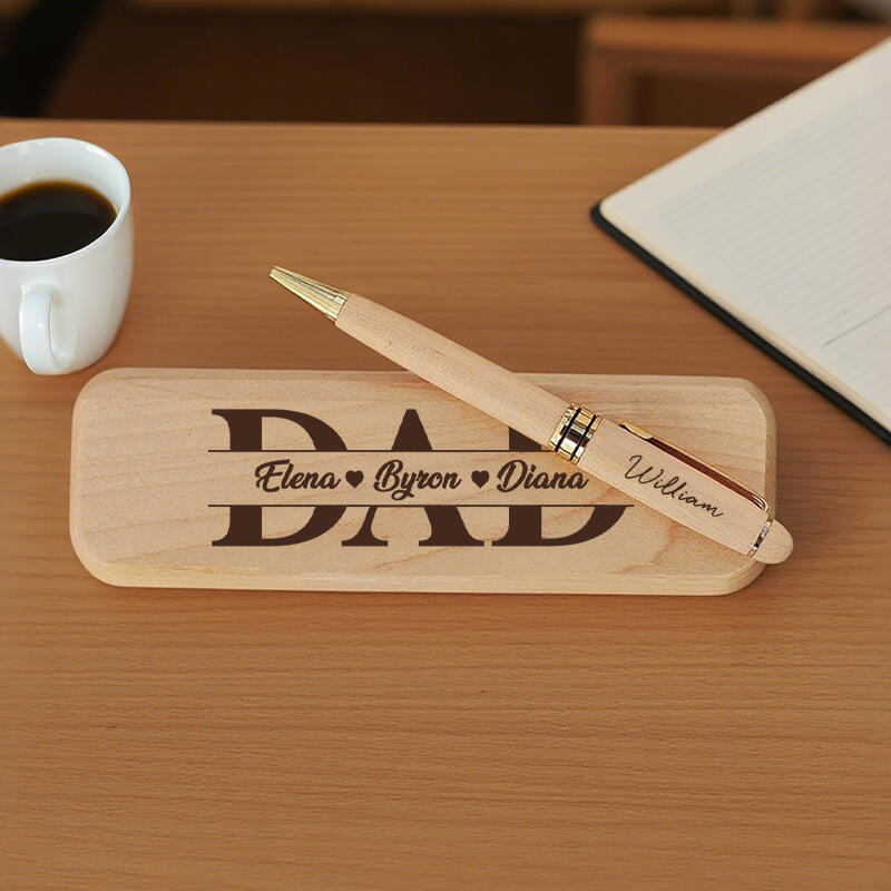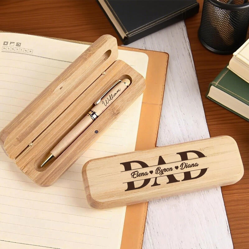 Bolígrafo personalizado en caja de madera con nombres personalizados, diseño de papá, regalo perfecto para el Día del Padre.